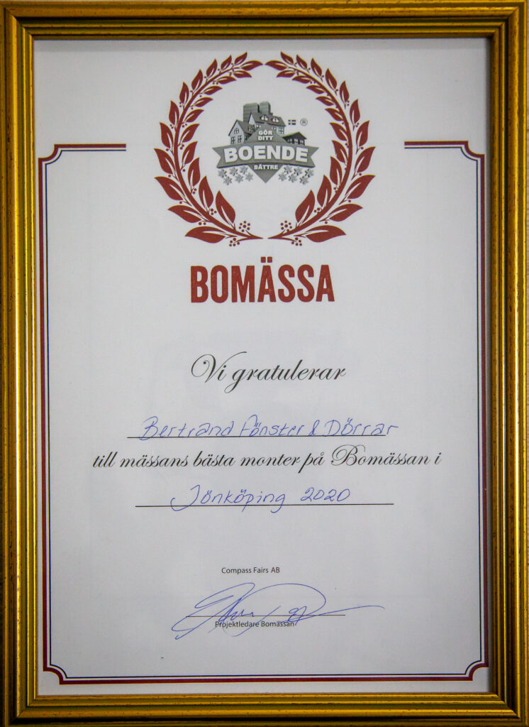År 2020 vann vi priset för bästa monter på Bomässan i Jönköping. Montern, som är från Bertrand, har turnerat över hela Europa och visats på de största mässorna. Nyheten på denna mässa var ett fönster som blir varmt och kan användas istället för ett element i hemmet.
